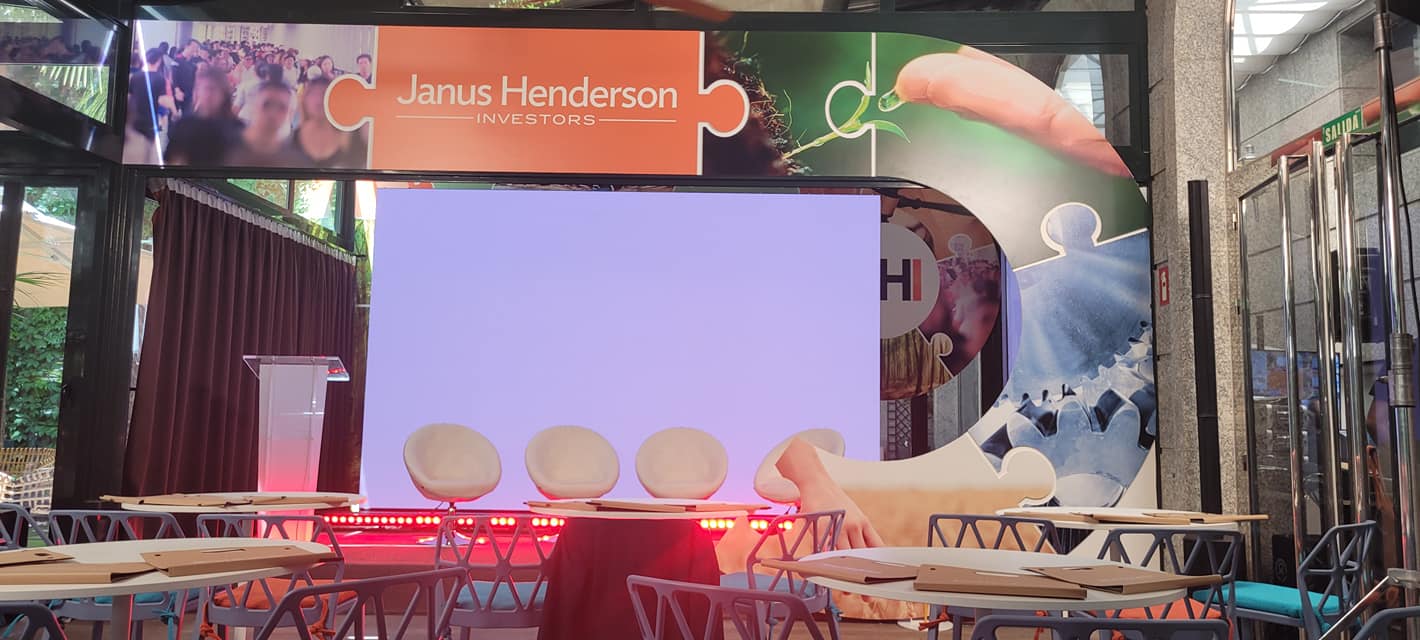 Decorado de escenario para evento en un patio interior de la Calle Serrano de Madrid.